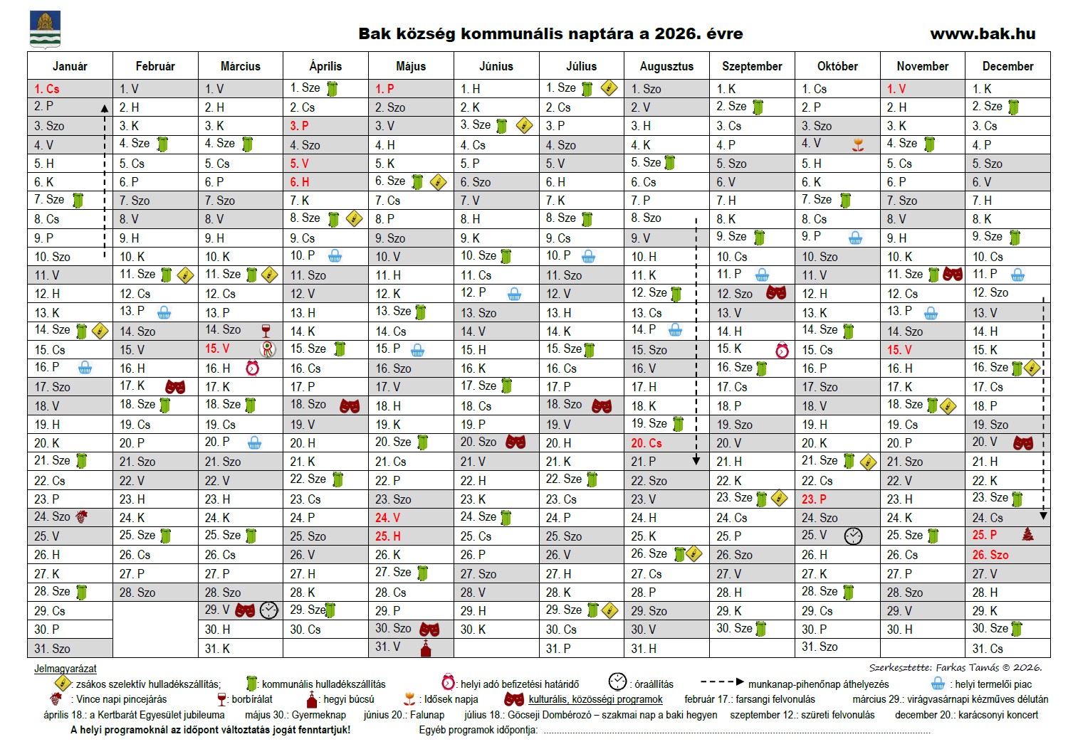 Szerepelnek benne a munkanap áthelyezések, a hulladékszállítási időpontok valamint az év során tervezett jelentősebb közösségi rendezvények dátumai.